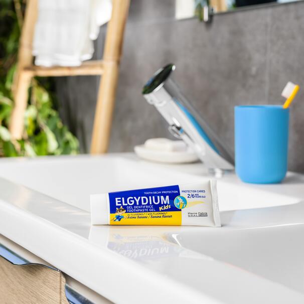 ELGYDIUM KIDS паста за зъби за деца от 2 - 6 години с вкус на банан предпазва млечните зъби от кариес, с вкус, който стимулира децата да искат да си мият зъбите.
