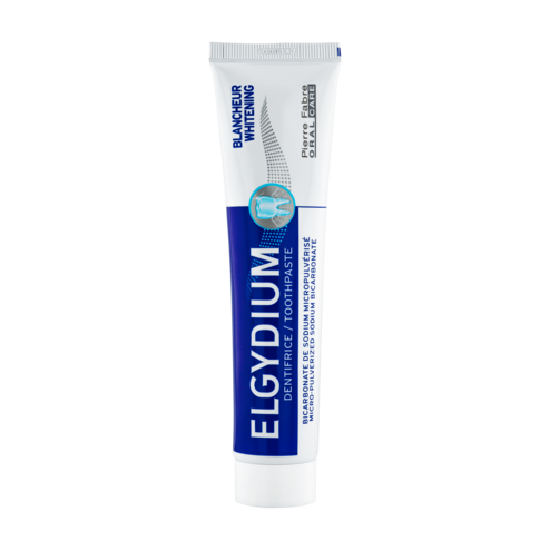 Усмихнете се и заблестете! ELGYDIUM WHITENING Избелваща паста за зъби спомага да се премахнат повърхностните оцветявания (от храна, тютюн и т.н.) и да се запази естествената белота на зъбите, като същевременно ги щади. Удължава избелващия ефект след отстраняване на зъбен камък или професионално избелване, за допълнителен блясък. Също така осигурява ефективна защита срещу кариес. Ефектът ѝ, видим след две седмици върху повърхностни оцветявания по зъбите, се увеличава с времето и продължителността на употреба. Бърза и дълготрайна ефективност според 90% от участниците**. Формулата ѝ съдържа микропулверизиран натриев бикарбонат с размер на частиците средно пет пъти по-малък от обикновените кристали на натриевия бикарбонат, за да прониква по-ефективно във вдлъбнатините на емайла.