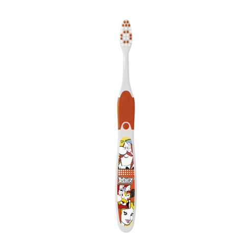 Μια απαλή, παιχνιδιάρικη, εργονομική οδοντόβουρτσα, διακοσμημένη με χαρακτήρες Αστερίξ.