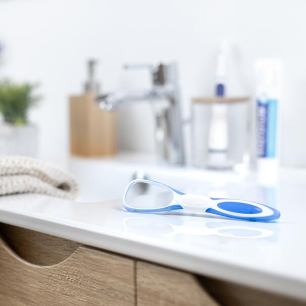 Um raspador de língua prático e higiénico, um passo extra da sua rotina de cuidados orais, para um hálito mais fresco.